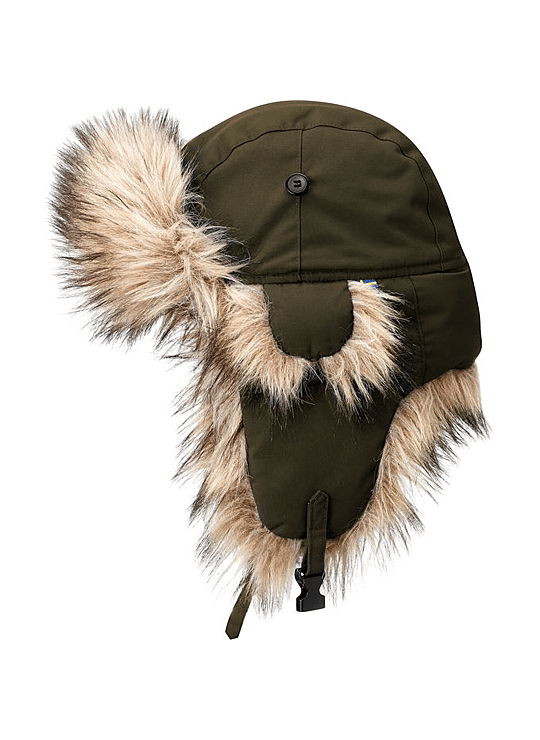 Extreem warme Fjällräven muts met synthetisch bont op de klep, oorkleppen en randen. Biedt perfecte warmte en beschermt tegen wind in zowel poolklimaten als bijtende wind. Het buitenmateriaal is zacht en stil polyester met een fluorkoolstof-vrije impregnering. De oorkleppen kunnen omhoog worden gezet met een knop aan de zijkant, of omlaag en met een strap onder de kin worden vastgezet zodat de muts ook bij sterke wind blijft zitten.