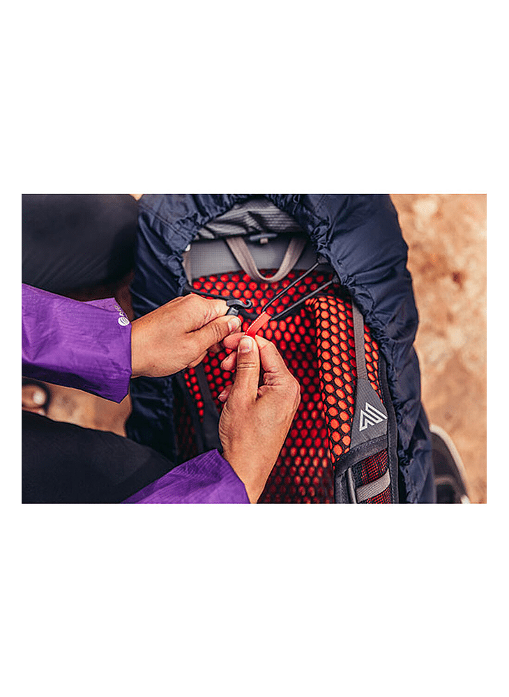 - Elastische trekkoordbevestiging met heupgordellussen en verstelbare haaksluiting om boven het harnas van de rugzak te worden geklemd